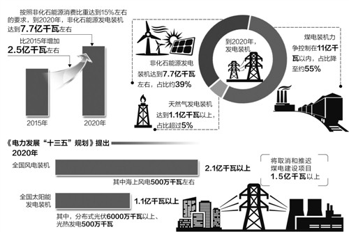 2016年11月7日,国家能源局召开《电力发展“十三五”规划》新闻发布会,国家能源局总工程师韩水表示,《规划》为突出能源结构转型升级的要求,增加了一个关键性原则,即到2020年我国非化石能源消费占一次能源消费比重达到15%左右。这次把这个目标定为硬目标,是必须要完成的。为了体现这一点,《规划》在电源结构优化的过程中优先布局清洁能源,在电力电量平衡的时候,首先平衡水电、风电、光伏和核电。 大力发展新能源 “十三五”时期是电力工业加快转型发展的重要机遇期。为保障全面建成小康社会的电力电量需求,《规划》明确,预期2020年全社会用电量6.8万亿至7.2万亿千瓦时,年均增长3.6%至4.8%,全国发电装机容量20亿千瓦,年均增长5.5%。人均装机突破1.4千瓦,人均用电量5000千瓦时左右,接近中等发达国家水平。 在电源结构方面。按照非化石能源消费比重达到15%左右的要求,到2020年,非化石能源发电装机达到7.7亿千瓦左右,比2015年增加2.5亿千瓦左右,占比约39%,提高4个百分点,发电量占比提高到31%;天然气发电装机增加5000万千瓦,达到1.1亿千瓦以上,占比超过5%;煤电装机力争控制在11亿千瓦以内,占比降至约55%。电源结构得到进一步优化。 “这要求我们大力发展新能源,优化调整开发布局。按照集中开发与分散开发并举、就近消纳为主的原则优化风电布局,统筹开发与市场消纳,有序开发风电光电。”韩水说。 《规划》提出,2020年,全国风电装机达到2.1亿千瓦以上,其中海上风电500万千瓦左右。按照分散开发、就近消纳为主的原则布局光伏电站。2020年,太阳能发电装机达到1.1亿千瓦以上,其中分布式光伏6000万千瓦以上、光热发电500万千瓦。按照存量优先的原则,依托电力外送通道,有序推进“三北”地区可再生能源跨省区消纳4000万千瓦。 与此同时,要加快煤电转型升级,促进清洁有序发展。严格控制煤电规划建设,合理控制煤电基地建设进度,因地制宜规划建设热电联产和低热值煤发电项目。积极促进煤电转型升级。“十三五”期间,将取消和推迟煤电建设项目1.5亿千瓦以上。到2020年,全国煤电装机规模力争控制在11亿千瓦以内。 着力解决“三弃”问题 对于当前比较严重的弃水、弃风、弃光等问题,韩水分析认为,其主要有布局、电网输送和系统调解能力三方面原因。 针对电网输送问题,韩水表示,要从电网建设上加强对可再生能源接纳和消纳的力度。首先是电网远距离输送,利用现有已规划建设的输电通道,着力加大可再生能源发电的外送力度。在“十三五”期间运用西电东送的输电通道增加4000万千瓦的可再生能源发电的外送。同时,在配电网建设上加大改造力度,进一步提高智能化水平,使可再生能源以分布式、微电网的形式接入系统就近消纳。 记者了解到,此次《规划》的一大特点,就是全面提升系统的灵活性,提高电力系统的调峰能力。主要是加大调峰电源的建设规模,其中,“十三五”期间新增抽水蓄能电站装机1700万千瓦;单循环调峰气电新增规模500万千瓦;为加大燃煤电站灵活性的改造力度,加大煤电调峰的能力,热电联产机组改造规模达1.33亿千瓦,常规煤电灵活性改造8600万千瓦,主要用于增加“三北”地区的调峰能力。 韩水说,为了配合这些政策,《规划》还提出电网方面要加强优化,负荷方面要加强电能替代的力度,特别是利用低谷电能替代,同时研究推进峰谷电价的政策,落实全额保障性收购制度,推进各种辅助服务市场等,通过硬件和软件建设的多措并举,保证可再生能源的健康有序发展,将弃风、弃光率控制在合理水平。 严控煤电发展 近年来,电力供需放缓趋势明显,煤电作为主力电源也面临新挑战。“‘十三五’以来,我国煤炭占能源消耗比重从2010年的69.2%下降到2015年的64%。我国承诺,2020年、2030年非化石能源消费比重要分别达到15%和20%左右,未来煤电要继续为非化石能源发展腾出空间。”国家能源局电力司司长黄学农说。 值得注意的是,煤电潜在的过剩风险也开始逐步显现。黄学农透露,火电利用小时从2013年的5021小时降到2015年的4329小时,降低幅度很大,今年预期在4000小时左右,“十三五”后几年预期还会进一步降低。目前各个地方规划建设的煤电项目仍然较多,煤电的潜在风险很突出,所以规划提出将“煤电装机力争控制在11亿千瓦以内”。 为达到这一目标,国家已经先后出台了多项措施。一是实行煤电建设规划的风险预警机制,分成红色、黄色、绿色预警,用以指导各地煤电的规划建设;二是对已经开工或者核准在建的项目采取缓核一批、缓建一批等措施;三是淘汰落后产能。 “通过这些措施把煤电控制在11亿千瓦以内是可以做到的,对经济社会发展需求也是能够保障的。”黄学农告诉《经济日报》记者,同时还可以避免出现电力富余,使煤电利用小时控制在合理水平。 除了严控煤电发展,加快电能替代也是优化能源结构的重要举措。目前,我国大量的散烧煤和原油消费是造成雾霾的主要因素之一。数据显示,我国每年散烧煤消费大概在7亿至8亿吨的水平,占煤炭消费总量的20%,主要应用于采暖小锅炉、工业小锅炉、农村的一些生产生活领域,与美国、欧盟散烧煤的水平相比非常高。 “大量散烧煤未经洁净处理直接燃烧,造成了大气污染物排放,这是我们考虑电能替代的主要背景。”黄学农表示,“十三五”规划对电能替代的目标