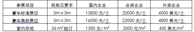 1、展位收费: 2、展位说明: A.标准展位配置:中英文楣板(高度25cm)、日光灯两盏、隔板(高度250cm,可用高度246cm)洽谈桌一张、椅子两把、可容400W/220V电源插座一个及地毯; B.订光地的展商自行负责展位布置的所需费用,详见参展商手册。 3、高峰论坛: A. 峰会演讲费用:国内企业20000元/20分钟,国际企业5000美元/20分钟,可容纳200人会议室,投影仪,屏幕,讲台,椅子,音响等; B. 企业代表参会费:3800元/人,包括参会证件、会议资料、午餐、饮料,协助代订宾馆、车票、飞机票等;