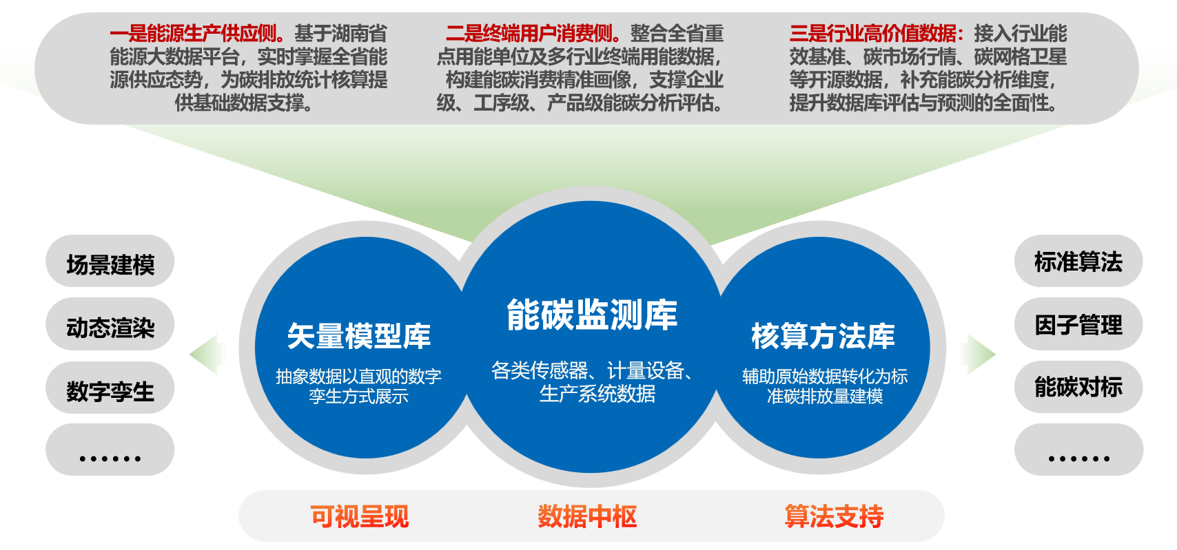 图1湖南省能碳数据底座构建方法 碳对标:已接入300余家年综合能源消费量万吨标煤以上重点用能单位,聚焦电力、钢铁、建材、有色金属、石化化工等行业能碳协同特性,打造工序级和产品级的能效碳效评估功能,完善相应能效碳效分级标准。